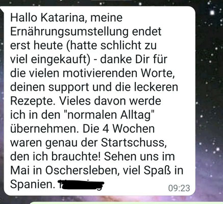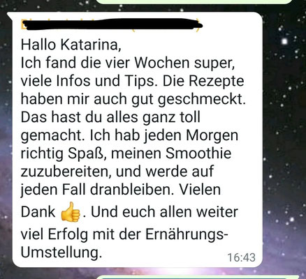 Die ganzen 4 Wochen betreue ich dich individuell auf deinen Alltag zugeschnitten, mit Rezeptideen und Tipps und Tricks zur Ernährung.